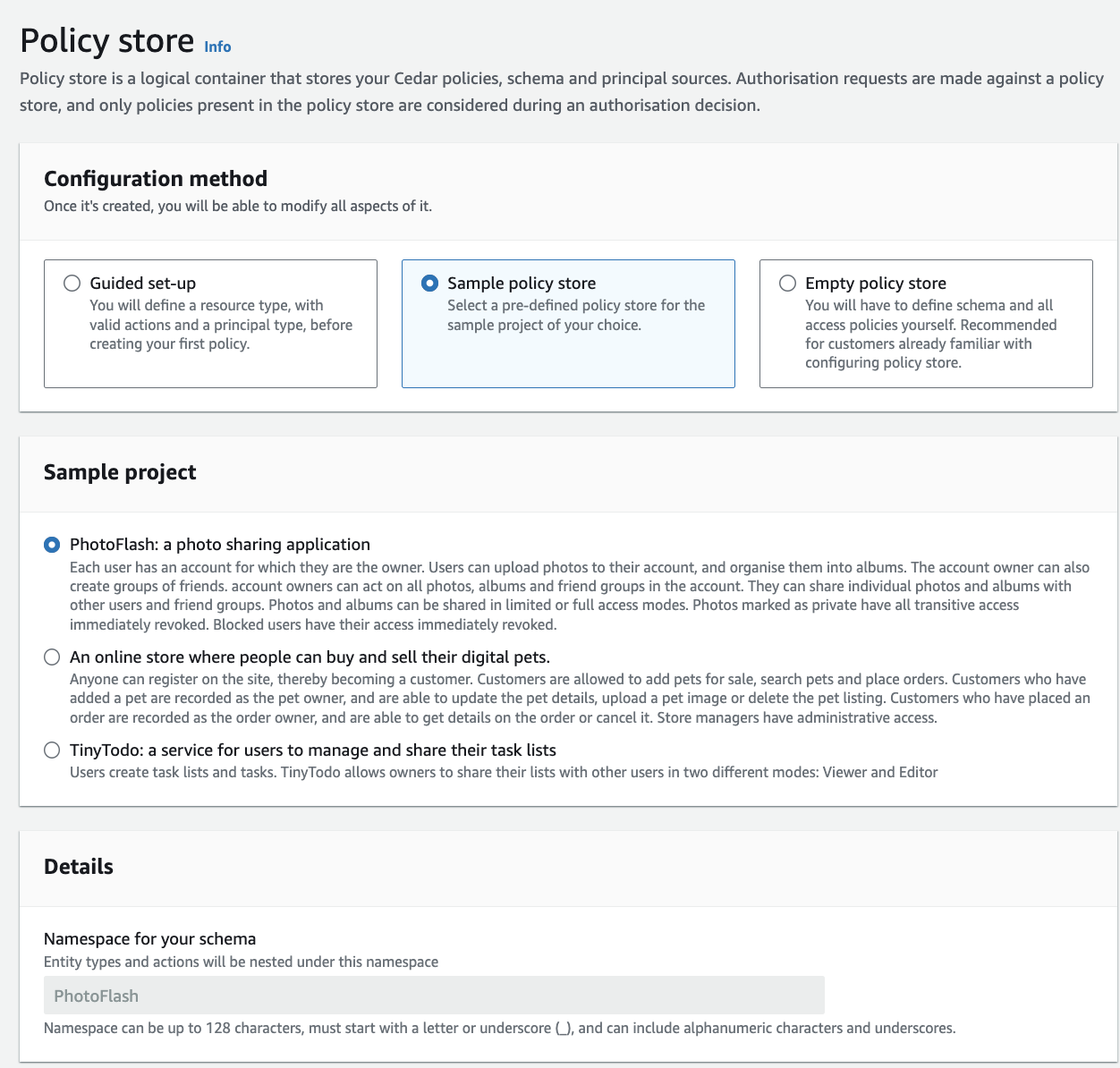 While AWS provides sample scenarios, they are not included here. However, during policy store creation, you can easily select a "Sample policy store" tailored for your project.