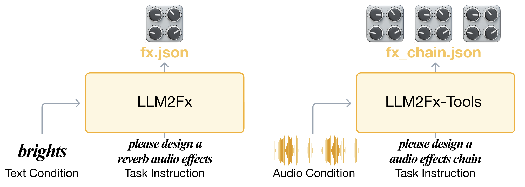 This repository contains the resources for two research papers that explore how Large Language Models can be applied to audio effect parameter prediction in music post-production. The first paper (LLM2Fx) investigates zero-shot and in-context learning approaches for text-to-parameter prediction, while the second paper (LLM2Fx-Tools) introduces a multimodal framework that fine-tunes LLMs to generate executable sequences of audio effect tool calls from audio-to-audio pairs.