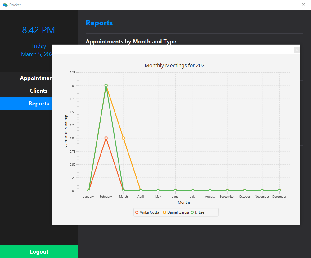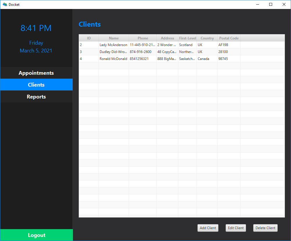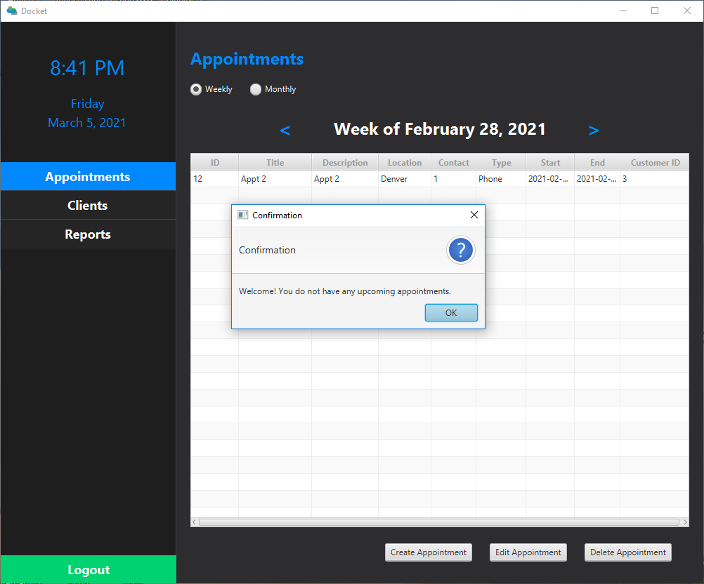 This Java application tracks customers, contacts, and appointments. Tracking business appointments can be a powerful tool to maintain relationships with clients and making sure you are maximizing potential business prospects. Persistant data is stored in a MySQL database. The UI will automatically switch between English and French depending on your computer's language settings.