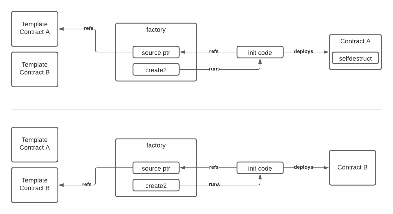 To avoid accessing the SLOAD operator while retrieving the implementation address, a combination of immutable variables, CODECOPY, CREATE2, and SELFDESTRUCT is used.