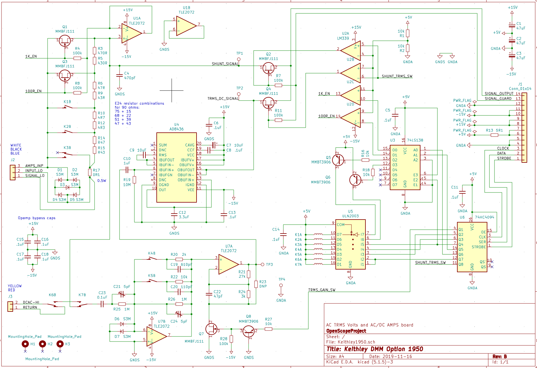 In the process some upgrades and some compromises were made. For example this version of 1950 option board is based on AD8436 trms chip that along with newer opamps provides higher bandwidth and better overall specs than much older AD536 of the original. On the other hand cheaper shunt resistors are used (because of their availability) with worse drift and tempco characteristics.